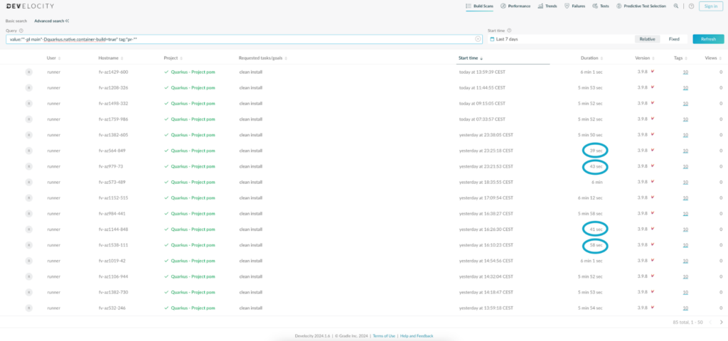 Looking below at the Develocity Build Scan® from the Quarkus Develocity instance we can see the cache hits at a glance by looking at the overall build time, reduced from 5+ minutes to less than a minute on such builds: