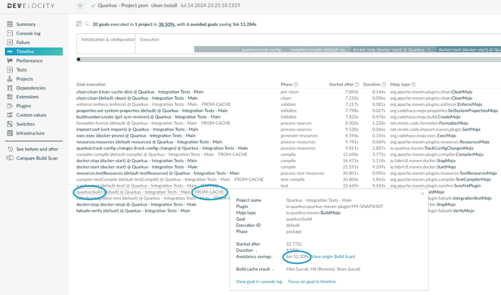 The screenshot below illustrates the savings obtained with a cache hit on the Quarkus build goal. By fetching the goal outputs from the Develocity cache, 4 minutes and 52 seconds are saved by not executing the quarkus:build goal unnecessarily: