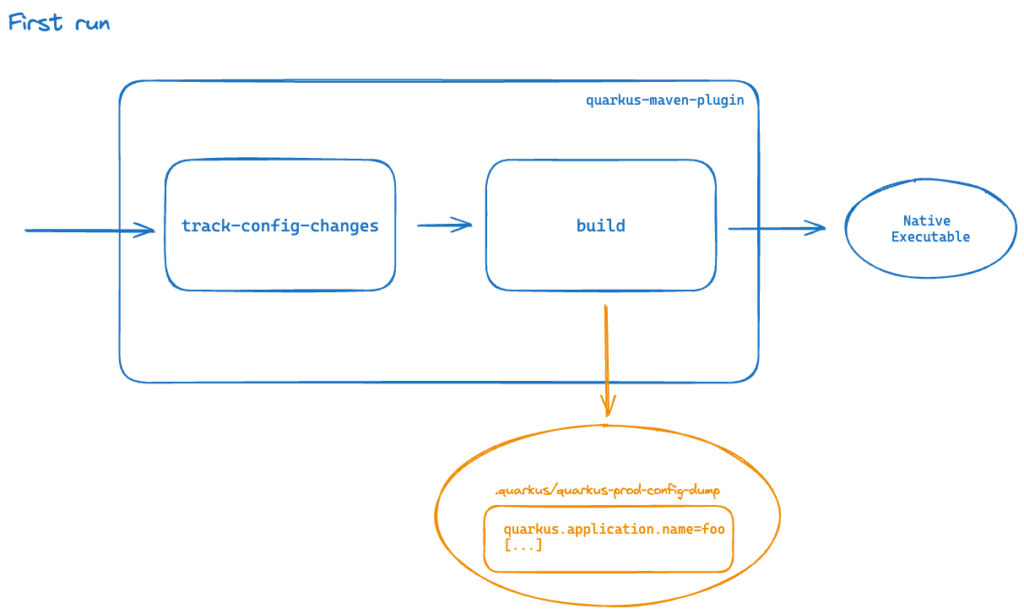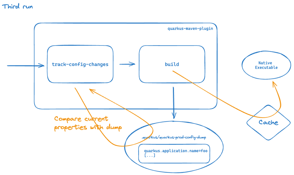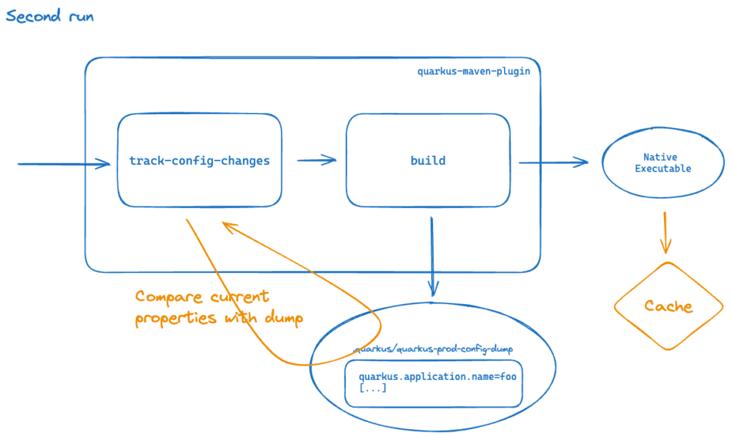 Thus, using the traditional way of collecting inputs to compute the cache key on the build goal does not work here. To address this, the Quarkus team created the track-config-changes goal which can query the actual value of the properties recorded in a previous build.