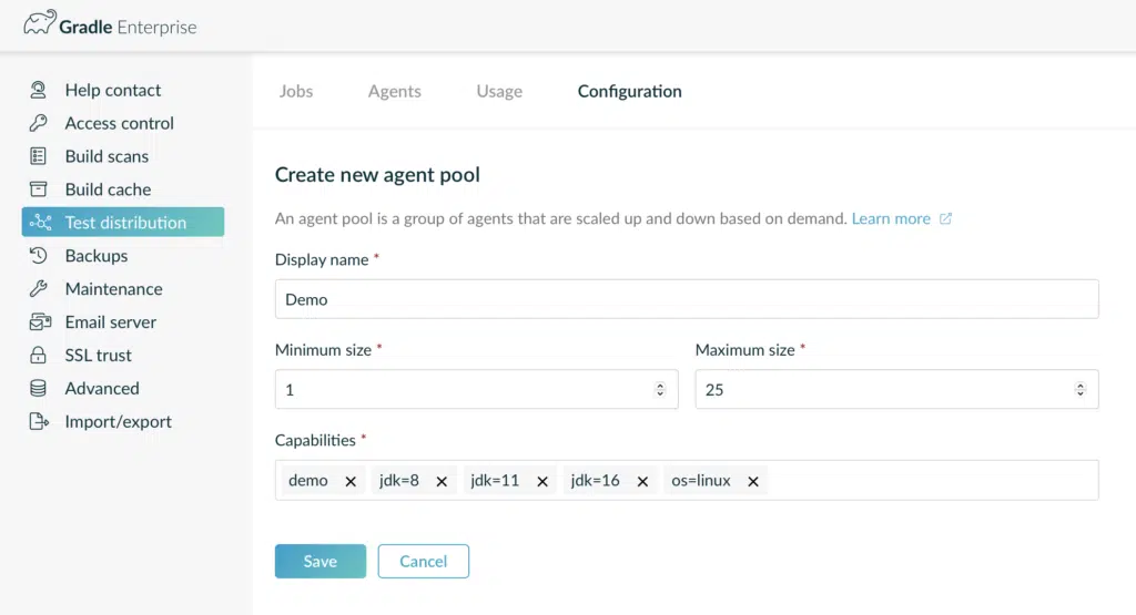 An agent pool has a name, capabilities, and defines a minimum and a maximum size. The minimum size specifies the least number of agents that should always be available at any given time. The maximum size makes sure that the number of agents doesn’t increase without limits.