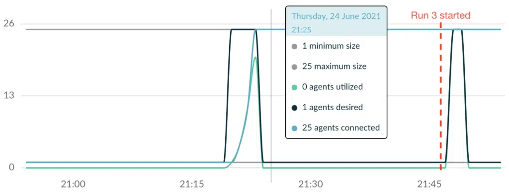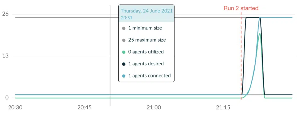As you can see, this build is much faster than the previous Run 2. A look at the agent usage chart shows us why this is the case:
