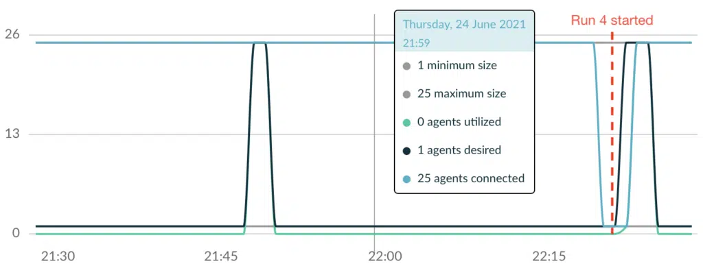 The number of desired agents immediately jumps to 25 as soon as the build has started (dark blue line). Agents start to connect to Develocity with a delay of about 2 minutes (light blue line). The reason for this delay is that Kubernetes first has to start new nodes in the cluster on which agents can then be started. The time to do this depends on the compute platform and is about 2 minutes in our case.