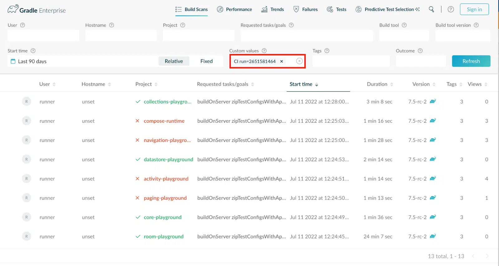 The GitHub Actions UI can be difficult to navigate for workflows that execute many Gradle builds. Another benefit of the Develocity integration is a direct link to view all of the builds for a particular GitHub Actions run if you have more than one action configured. In the screenshot below, we’re filtering for a specific GitHub Actions run ID to see all the builds that were part of the same CI workflow.