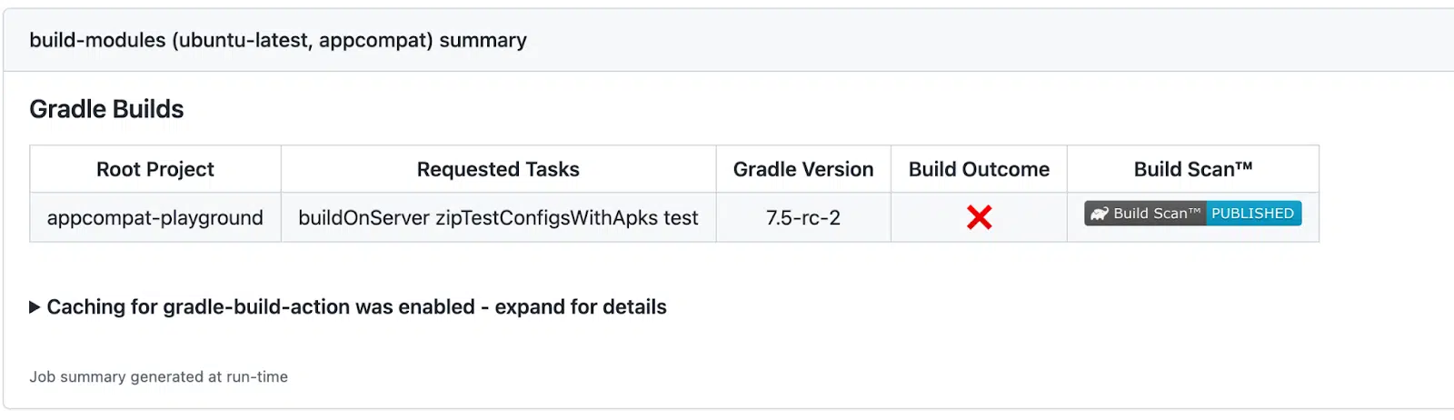 Does this sound familiar? That was the sort of complaint the AndroidX team heard that led them to add Develocity to their build and test experience. Integrating Develocity into the GitHub Actions CI process started with the Gradle Build Action, a GitHub action that simplifies configuring and running the Gradle Build Tool, leveraging the GitHub Actions cache, and working with Develocity Build Scans.