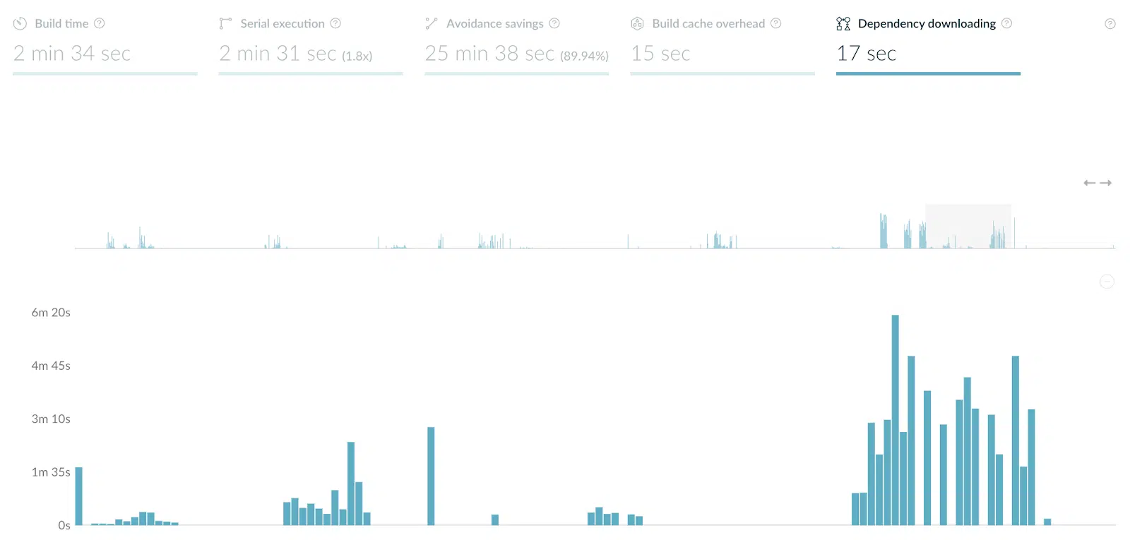 Develocity Build Scans capture critical information regarding build infrastructure, dependencies, and performance that are not included in the CI logs alone. In one particular example, Aurimas looked at the Develocity Performance dashboard and noticed that the time spent on Dependency Downloads was very high. Develocity shows you Dependency Download times as part of the default view of the Performance Dashboard. Aurimas could identify which particular builds had high dependency download times and view a corresponding Build Scan to get the network activity information with one click. The network activity made it clear that the Gradle Build Tool was repeatedly trying to download dependencies from the wrong location. Without Develocity, this would have been very difficult to determine. Aurimas wrote a blog post about his troubleshooting process and how resolving the issue cut at least 27 minutes from his CI build time. We encourage you to check it out to get a first-hand account of the experience.
