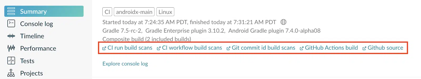 Using Build Scan custom links, it’s easy to navigate to the GitHub source repository and GitHub Actions UI, as well as other Build Scans from the same CI workflow run or associated with the same commit ID.