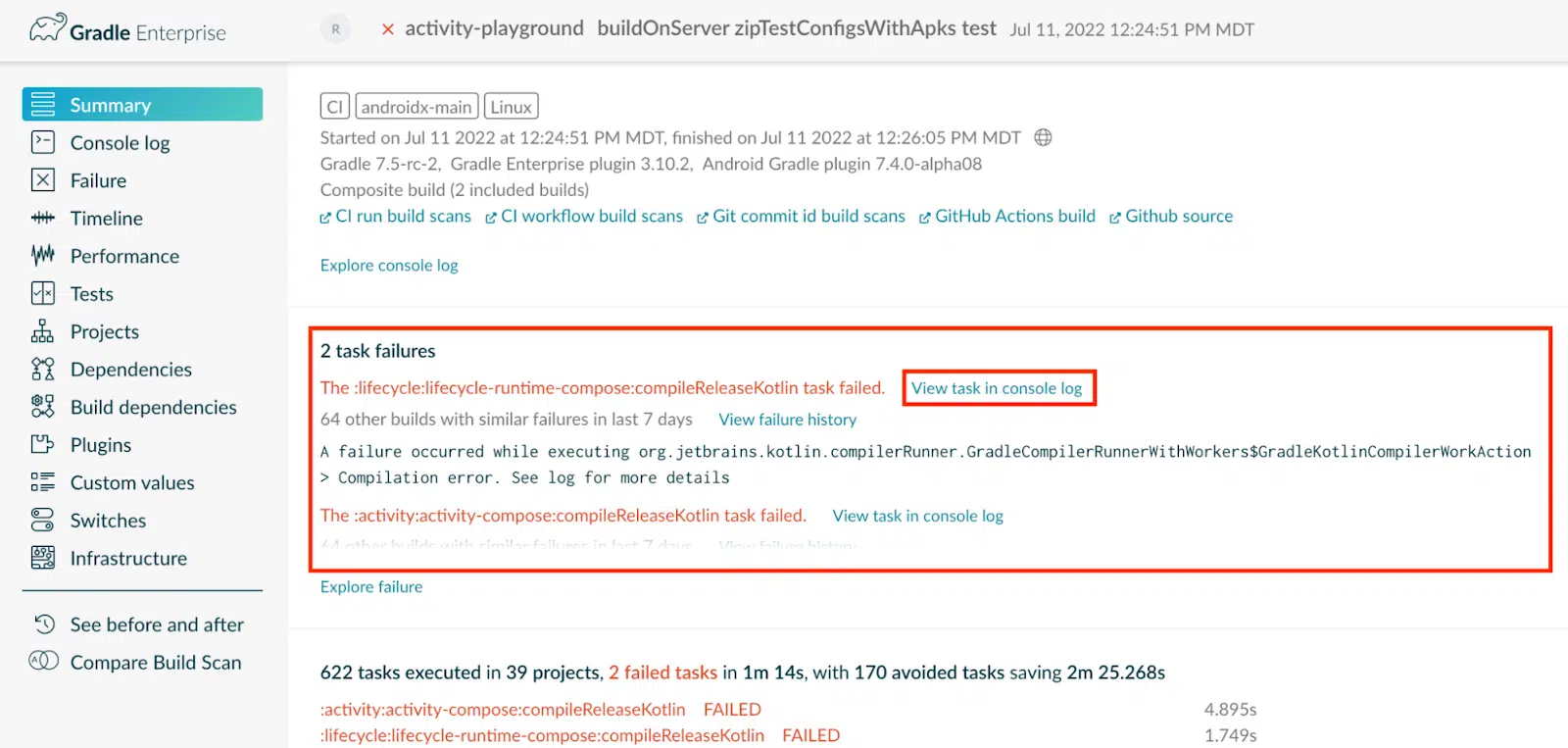 Looking at this same build from a Develocity Build Scan provides a dramatically better troubleshooting experience. The task failures are listed concisely with a helpful link to “View task in console log” located on the summary page.