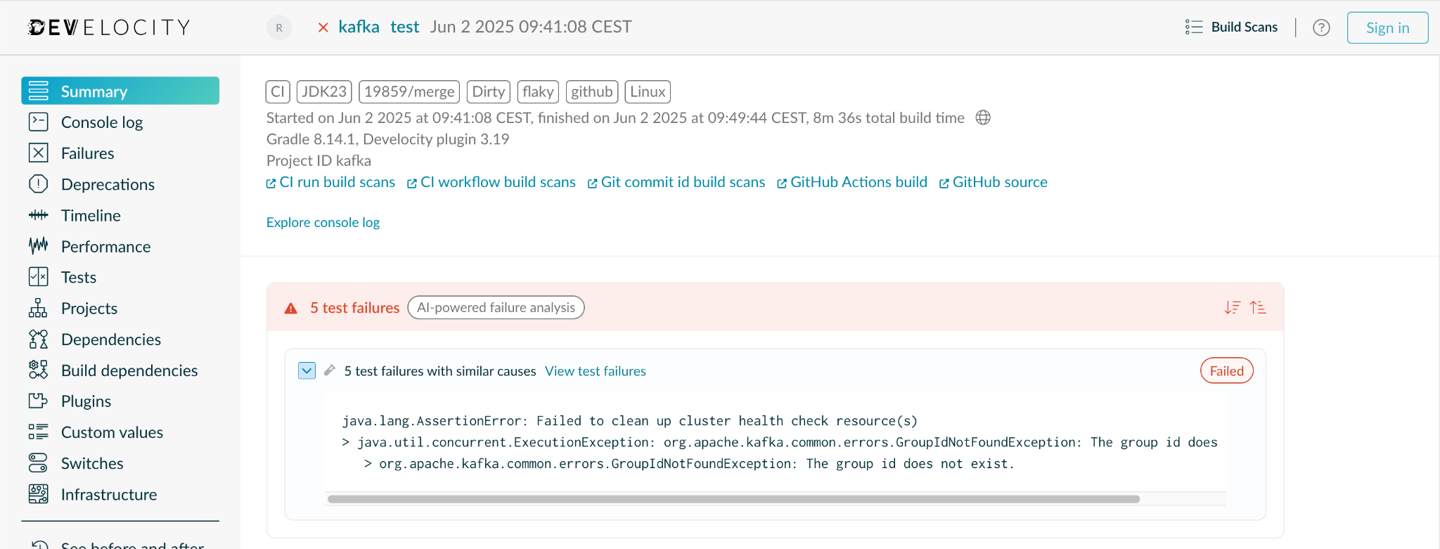 This immediate access is invaluable when you encounter failures. You can open the failed task in the browser with one click, accessing advanced features like AI-driven Failure Grouping in Develocity. For example, in this Build Scan from the Apache Kafka project 5 separate test failures failed for the same reason and are grouped together. And there is so much more value in Develocity, check out https://gradle.com/develocity/.