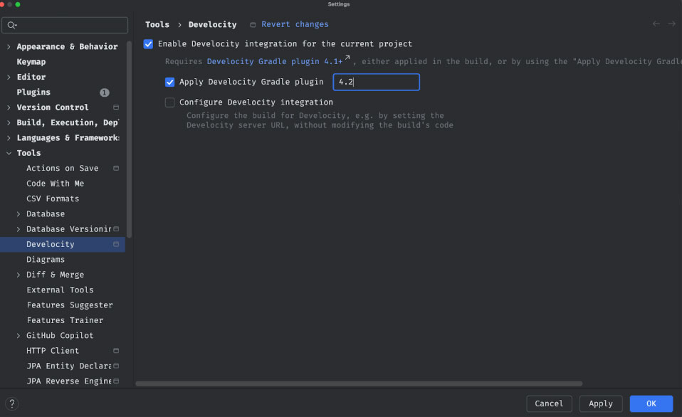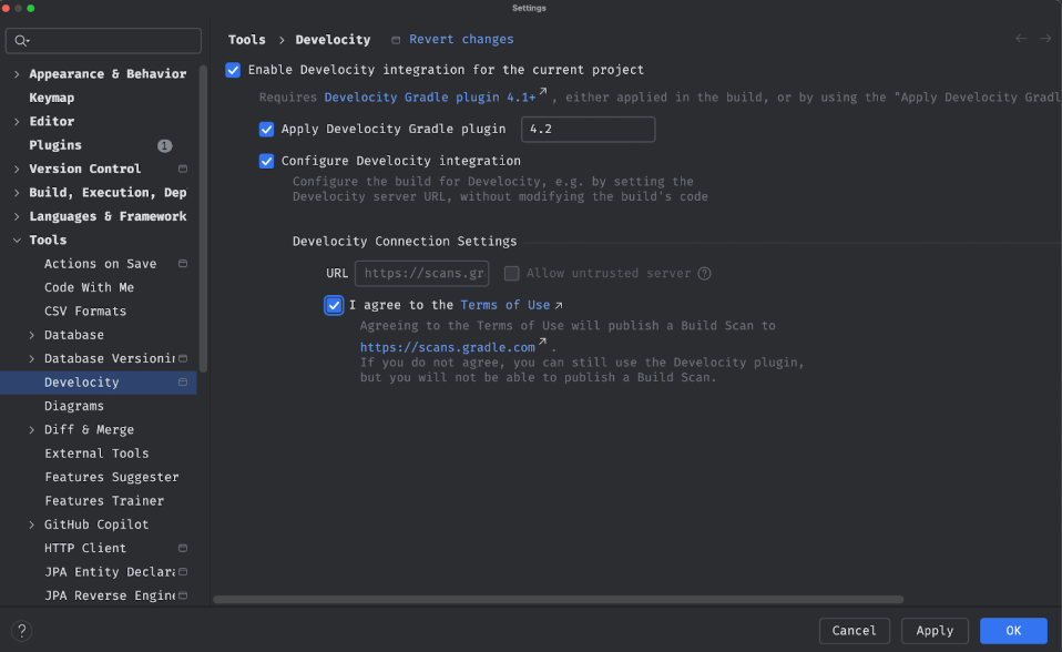 The Live Build Timeline feature requires the Develocity Gradle plugin 4.1 or newer to be applied to your Gradle build so that the IntelliJ plugin can receive data from the build process. Let’s use the Develocity settings to do that.