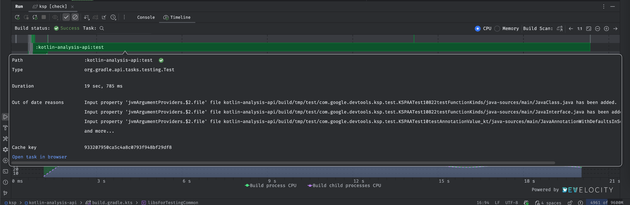 Looking at the Timeline view in the “Run” window, we observe the task execution. It’s clear that tests are taking up the majority of the build time, which is common in many projects.