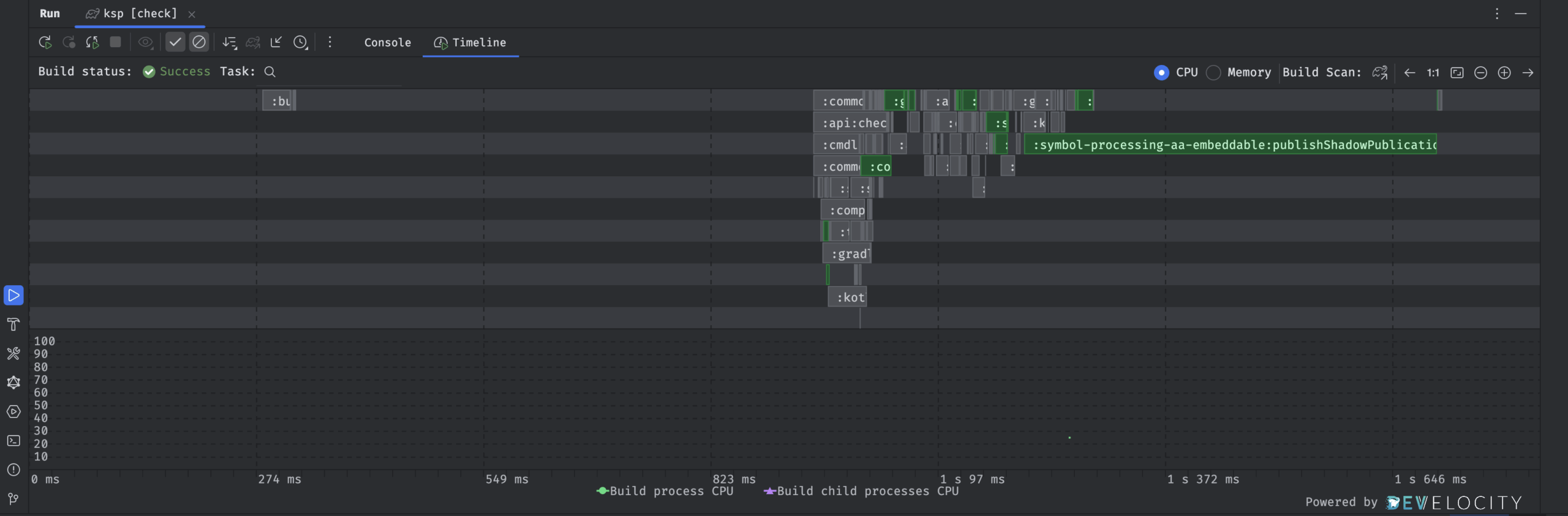 One of the standout features of this initial release is the Live Build Timeline. This timeline gives you immediate insights into your Gradle build performance with a detailed visualization of task execution and resource consumption (CPU and memory). Crucially, you get this initial level of insight without needing a Develocity server, subscription, or connection to the free public Build Scan® service.