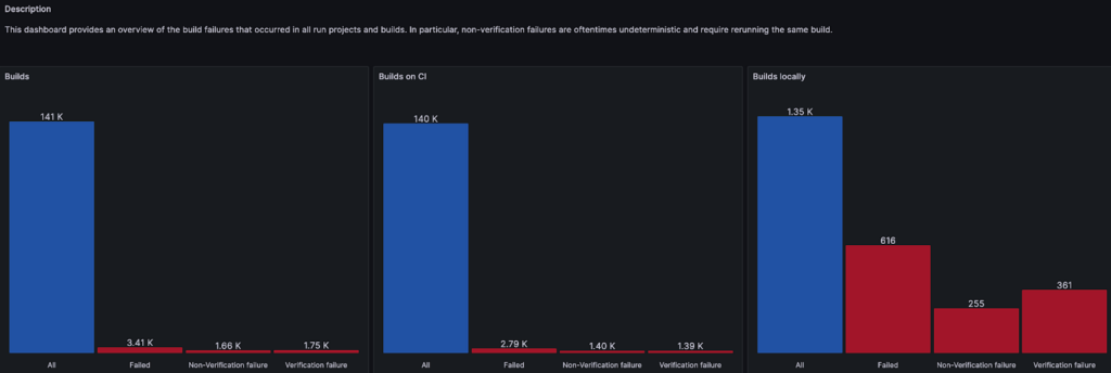 The Grafana dashboards give customers out-of-the-box visibility on a range of data that is available via the build system. For example: