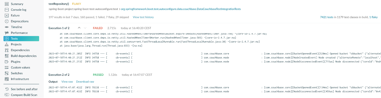 2. Investigate Test Failures: Once you’ve identified a flaky test, you’ll want to find out why it’s failing. Develocity Build Scan® provides a detailed examination of each build and test run, delivering a granular view of the data. The Build Scan will show you why a test was flagged as flaky.