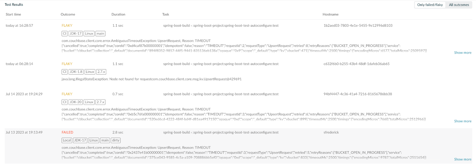 3. Leverage Historical Data Analysis: One of the primary challenges with flaky tests is the difficulty in reproducing issues for analysis. Develocity tracks all test executions over time, which enables you to compare different runs. With this data, you can see when and where the test passed or failed, under what conditions, and in which context. This can provide the vital clues needed to understand the circumstances under which tests fail.