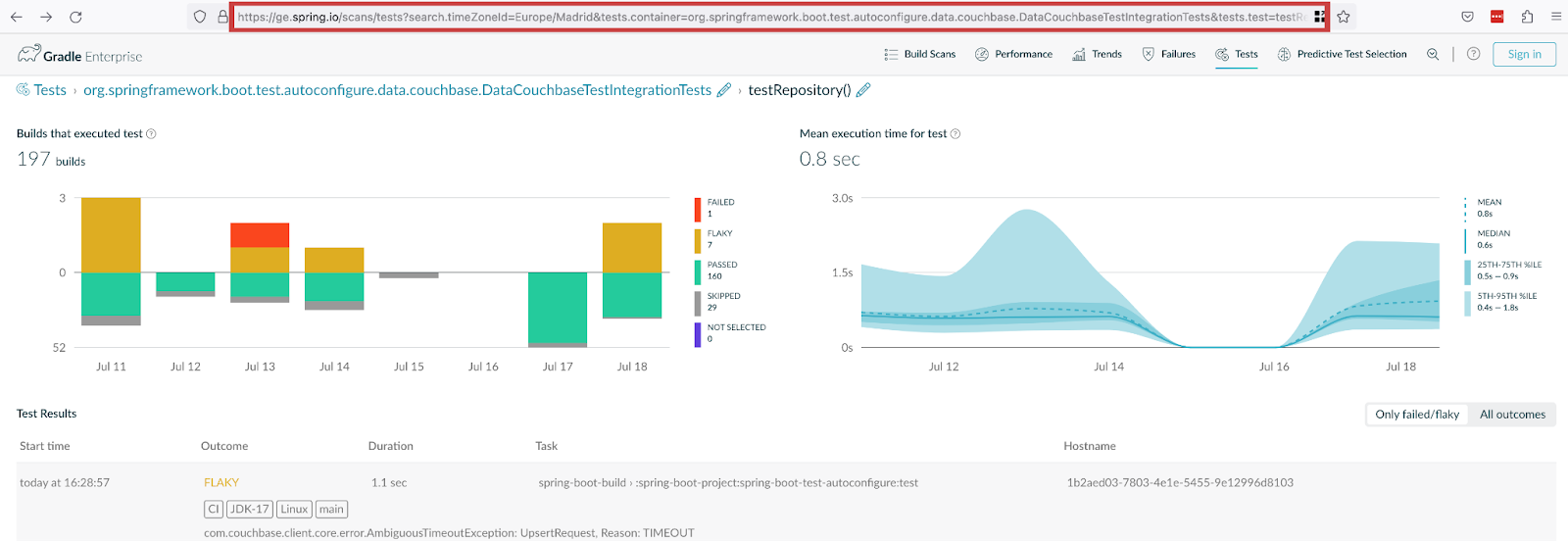From a comprehensive set of options, you can use the Build Scan to drill down into details about the tests’ environment, inputs, and outputs, which may give you clues as to why it unpredictably fails.