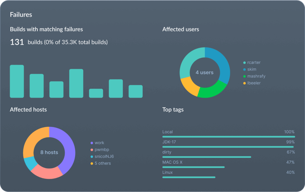 By collecting failure data from every build across every project and surfacing that data in multiple interfaces—through built-in dashboards, seamlessly integrated business intelligence/reporting tools, or directed AI prompts—development teams are empowered to solve issues rapidly as they arise and proactively improve build reliability over time.