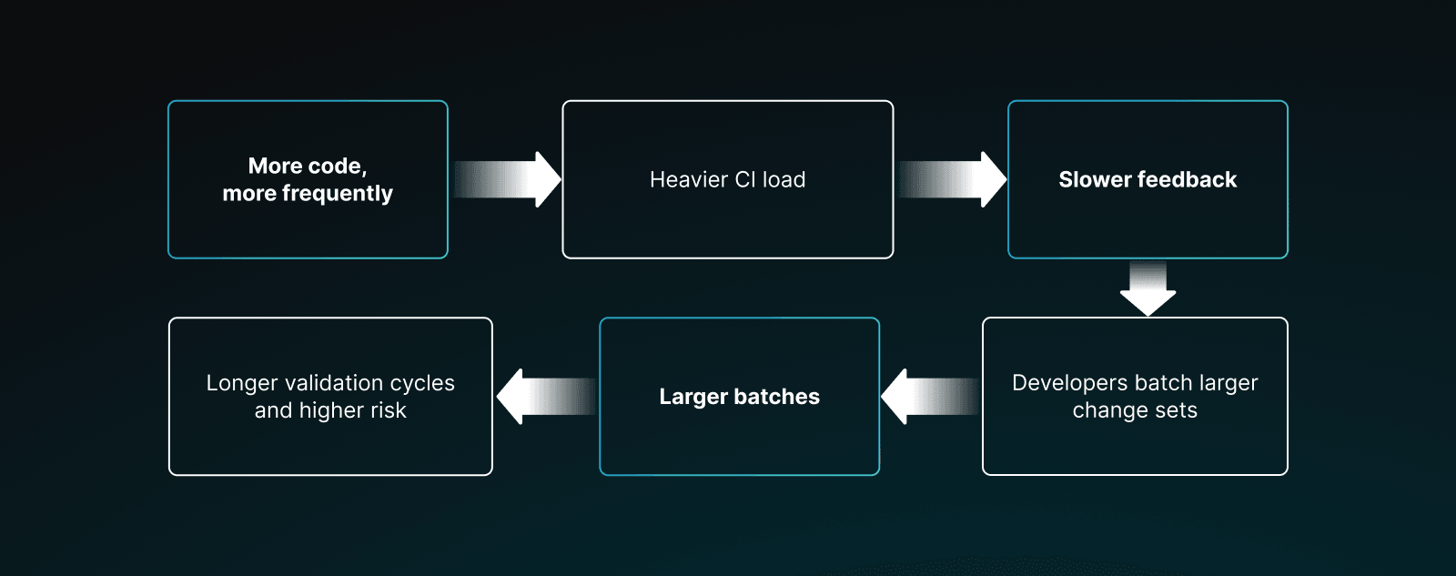 AI-generated code and tests multiply pipeline load and concurrency. Without acceleration, this additional stress causes a host of other issues, including queued build and resource starvation, timeouts and flaky test results, and wasted compute from retries and redundant work.