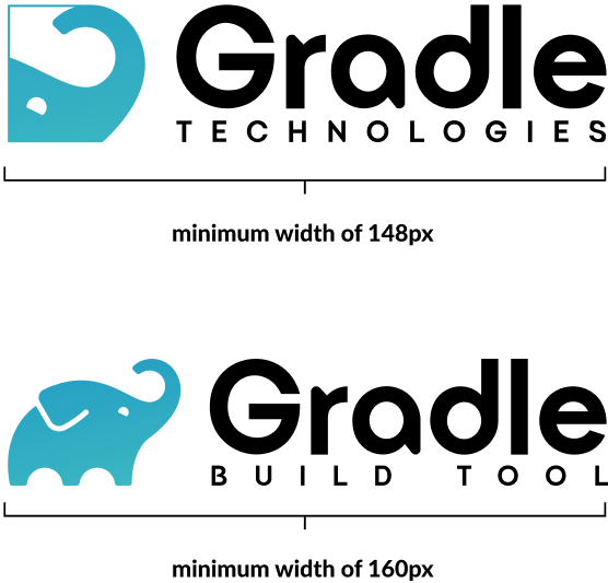 Adhering to the minimum size ensures impact and legibility of the logo. The Gradle logo should never be smaller than 150px wide.